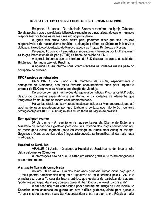 Belgrade, 16 Junho - Os principais Bispos e membros da igreja Ortodoxa Servia pediram que o presidente Milosevic renuncie ao cargo alegando que o mesmo e responsável por todos os danos causado ao p...